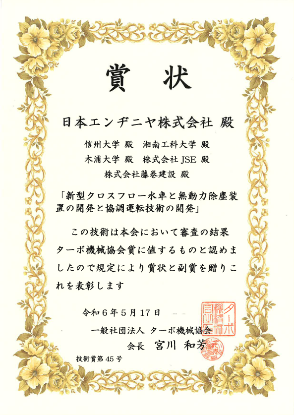 弊社は、信州大学、湘南工科大学、木浦大学(韓国)、株式会社JSE、株式会社藤巻建設と共に一般社団法人ターボ機械協会の「ターボ機械協会賞(技術賞)」を受賞しました。